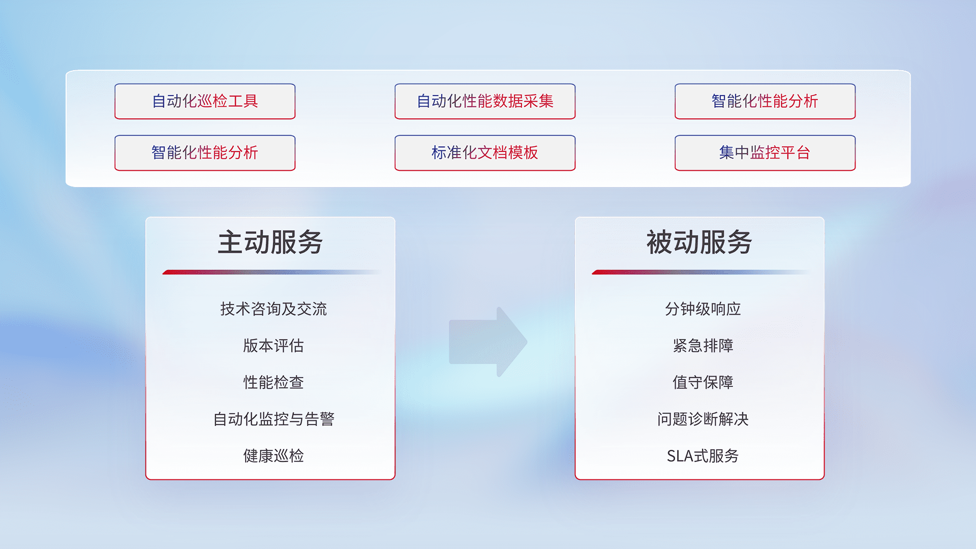 智能化工具和标准化文档,,,保障服务质量,,,提供主动服务(包含技术咨询、、、、版本评估、、、、性能检查、、、、自动化监控与告警、、、健康巡检)和被动服务包含(分钟级响应、、、、紧急排障、、值守保障、、、问题诊断解决、、、、SLA服务)。。