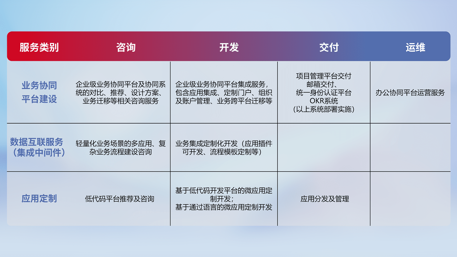 针对钉钉、、、、企微、、、IDaas等平台级产品提供产品的规划、、、、方案、、交付、、、定制化开发等服务,,,实现如统一协同办公、、智能客户服务、、混合会议管理、、智能数据查询、、等业务场景,,实现数字化转型。。。